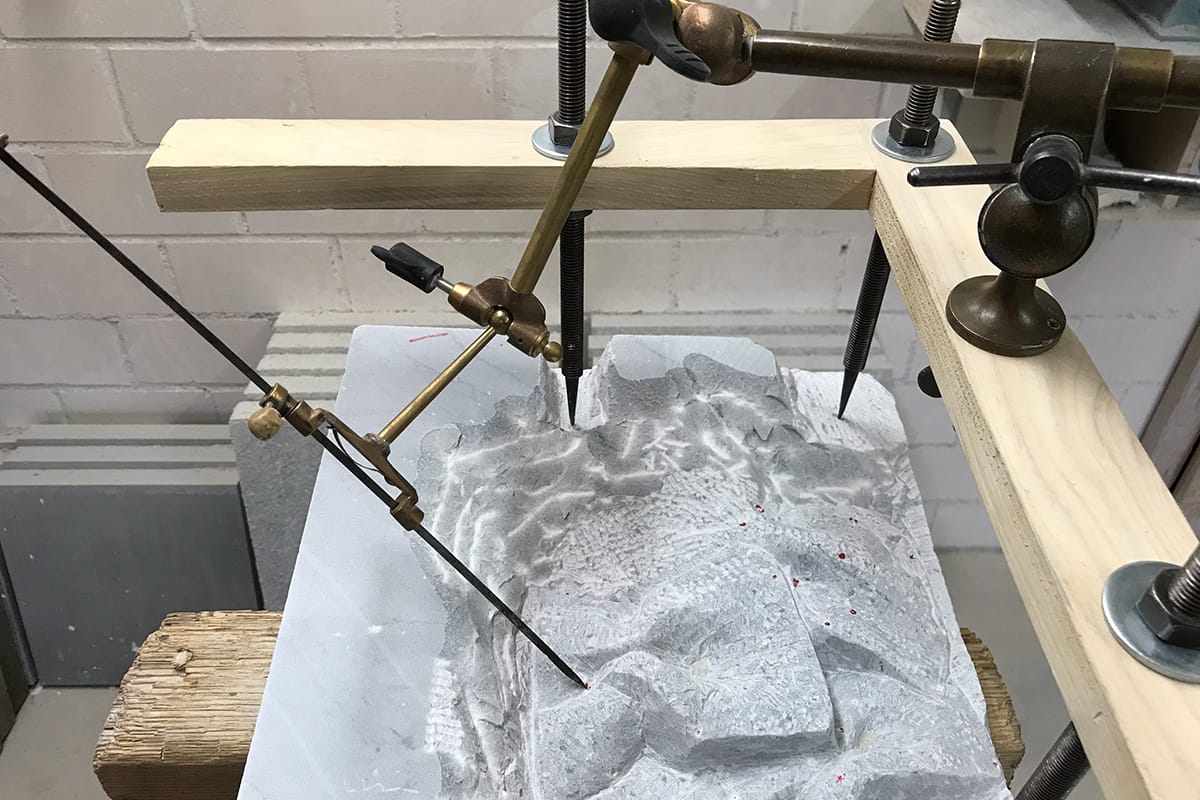 Mit dem Punktiergerät kann ich Figuren äusserst präzise und formgetreu 1:1 in Stein übertragen. Diese Methode ermöglicht eine exakte Reproduktion von Formen und Objekten.
